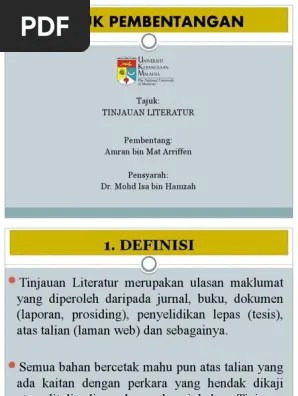 Definisi tinjauan literatur merupakan ulasan maklumat yang diperoleh daripada jurnal, buku, dokumen (laporan, prosiding), penyelidikan lepas (tesis), atas .